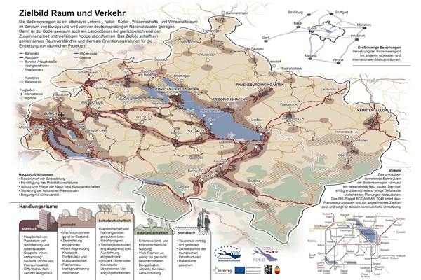 Das Zielbild Raum und Verkehr enthält gemeinsame Stoßrichtungen für Siedlungsentwicklung, Mobilität und Landschaft in fünf Raumtypen, die prägend für die internationale Bodenseeregion sind. Es basiert auf den bestehenden Raumkonzeptionen der Länder, Kantone und Regionen. Das Zielbild Raum und Verkehr stellt vergleichbare Inhalte auf gleicher Maßstabsebene dar und schafft damit eine wichtige Grundlage, um Herausforderungen wie Zersiedelung, Mobilitätswachstum, Schutz und Pflege von Natur- und Kulturlandschaften, künftige Energieversorgung oder Umgang mit dem Klimawandel gemeinsam anzugehen.